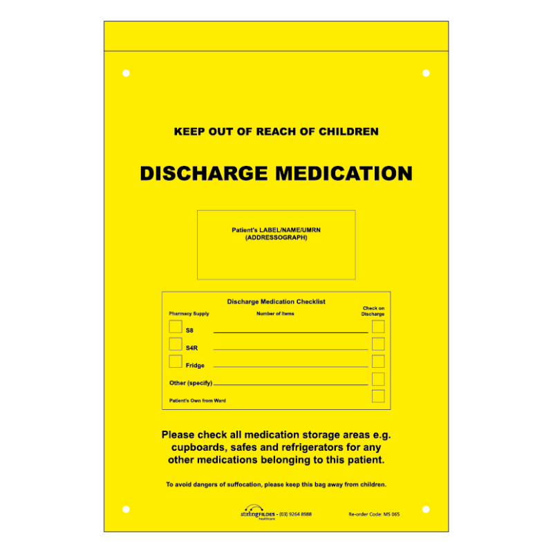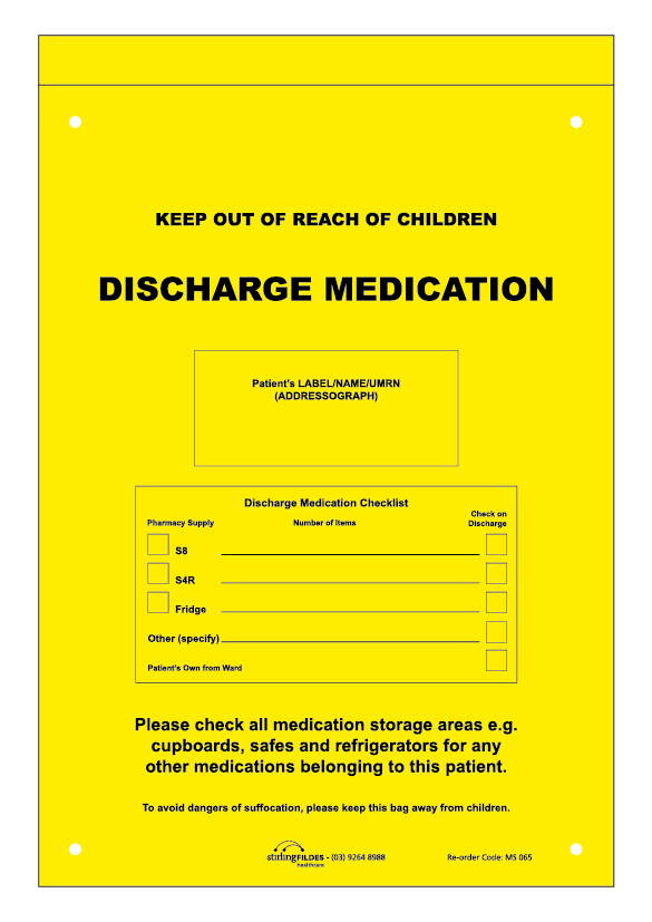 Yellow resealable bag specifically designed to identify and alert pharmacy / nursing staff to Patient's Medications on discharge.