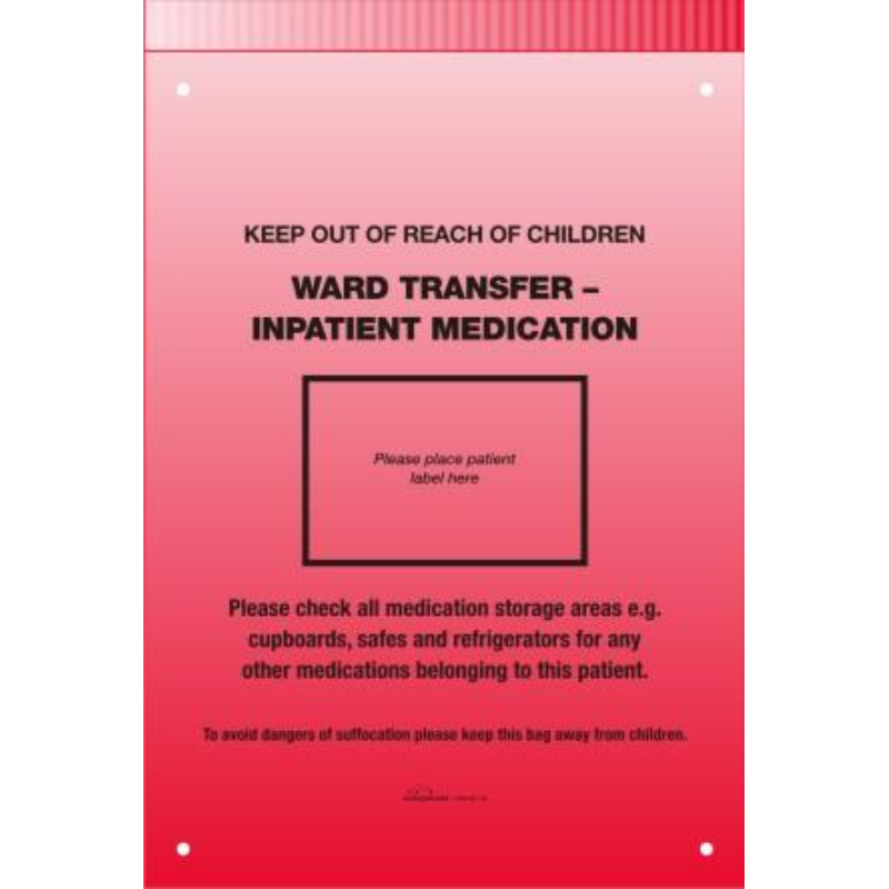 Red resealable bag specifically designed to be used when patients are transferring between wards to allow staff to identify and handover medications belonging to the patient.